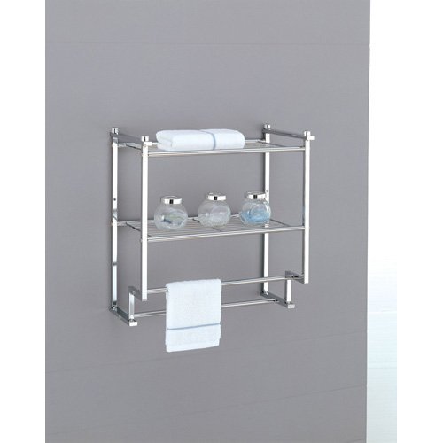 PRODUCT DESCRIPTIONS:Save valuable counter space in your bathroom with the Organize It All 2-Tier Towel Rack. Use the shelves to neatly organize your bathroom essentials and keep your shampoo and makeup where it belongs. The bathroom rack comes with two towel bars for added convenience and additional storage space. It is made from durable metal in a sleek chrome finish, which makes it long-lasting and able to withstand dampness. This wall mount towel rack with towel bars also helps to tie your bathroom decor together. With it's simple and attractive design, it makes an ideal piece for nearly any scheme. The Organize It All 2-Tier Towel Rack is also easy to install and comes with instructions to guide you through the process. The OIA Metro Wall Mounted Towel Rack makes storing bathroom essentials easy. This elegant and sturdy metal towel rack is sturdy and will last for years to come. The Metro Wall Mounted Towel Rack from OIA features a stunning chrome finish that is aesthetically appealing. With a sturdy structure, this rack includes a two tier wall mounting rack, two metal wire shelves for storage, and two towel bars.