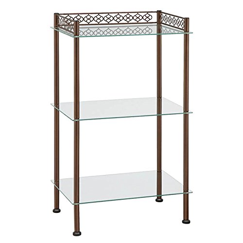 PRODUCT DESCRIPTIONS:Make your bathroom as stylish as the rest of your home with the Organize It All 63413W-1 3 Tier Wide Shelf. Made of durable and sturdy metal, the Moroccan-inspired design features a rich oil-rubbed bronze finish. Three tempered glass shelves add sparkling beauty and convenient storage for towels, accessories, and toiletries. About Organize It All With masterful designs using top-quality materials, Organize It All is dedicated to providing convenient and stylish storage solutions for every room in your home, believing that a well-organized environment is more enjoyable. Offering over 500 products for everyday use, the company maintains warehouses in Saddle Brook, New Jersey, and Costa Mesa, California, for quick delivery to your home. Dimensions: 18L x 12W x 30H in.. Metal with oil-rubbed bronze finish. 3 handy open shelves. Tempered glass shelves add beauty. Chic modern convenience.