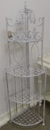 PRODUCT DESCRIPTIONS:Ornate Corner unit - Antique white metal Tall 4 Shelf shelving Unit With Scrolls. Ideal for conservatory, bathroom or garden. This item will ware outdoors and must be painted with outdoor paint to protect from rust. Height: 140cm Width: 33cm Depth- 33cm Shelf Height: 30cm