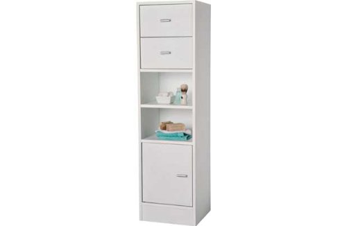 PRODUCT DESCRIPTIONS:This attractive white storage unit has a tall space-saving design with 3 built in cupboards and 2 shelves. Made from wood effect. Large drawer unit: 2 drawers. Size H120, W33, D31cm. Self-assembly.