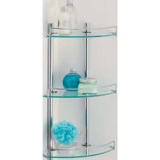 This contemporary bathroom shelf has a stylish glass finish and space-saving corner design.